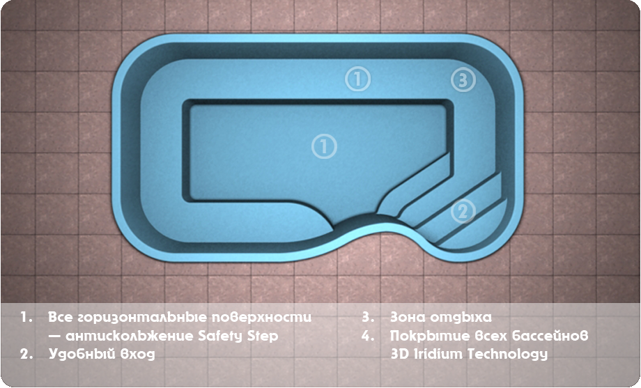 «Гибралтар» представляет собой просторный бассейн и по своим масштабам является одной из самых крупных моделей «Admiral Pools». Возможна установка без